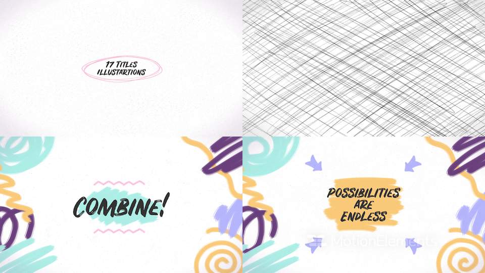 Scribbles Hand Drawn Pack은 귀엽고 독창적인 에펙 템플릿입니다. 이 팩에는 52개의 애니메이션 항목이 있습니다. (17개의 타이틀 일러스트, 1개의 타이틀 애니메이션, 9개의 텍스쳐, 9개의 낙서, 8개의 트랜지션 및 8개의 애니메이션 아이콘) 이 장난스러운 느낌의 귀엽고 매력적인 애니메이션 에펙 템플릿을 사용하면 청중의 관심을 사로잡을 수 있습니다. 지금 바로 작은 투자로 큰 감동을 느껴보세요!